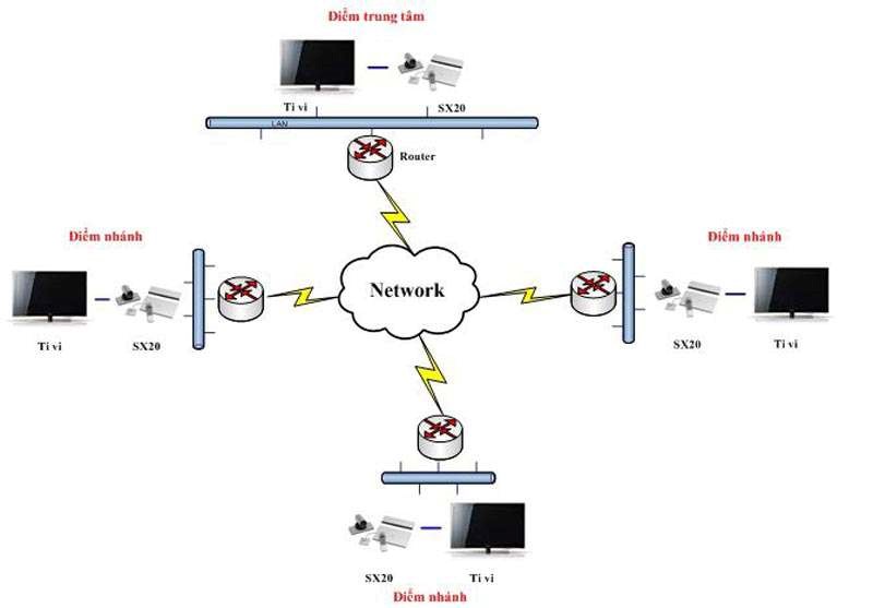Nhìn vào sơ đồ trên chúng ta có thể dễ dàng nhận thấy, các thiết bị đầu cuối có tính năng giống nhau, mỗi một điểm cầu truyền hình hội nghị sẽ bao gồm các thiết bị thu và phát video, thiết bị mạng cisco sẽ đảm nhiệm vai trò truyền tải và kết nối khớp nối hệ thống IP của các điểm cầu vào một hệ thống chung.